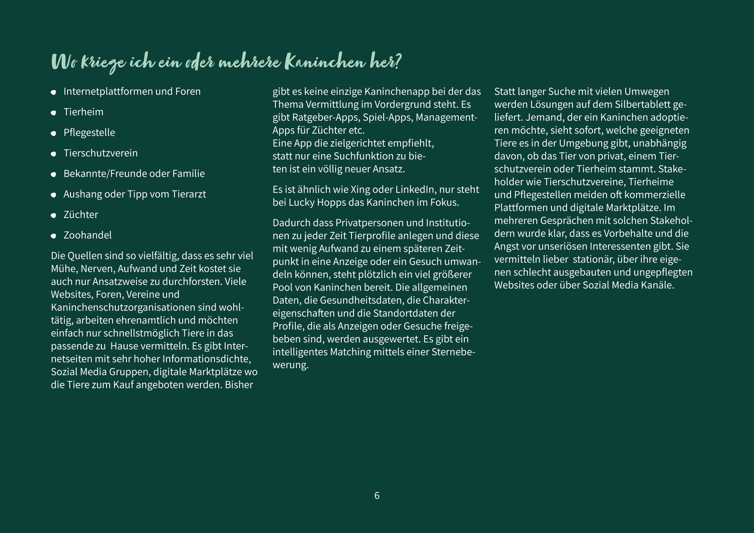 Lucky Hopps ist eine Vermittlungs-App für Kaninchen. Tiere gelten in Deutschland als eine Sache. Wenn Sie gehalten oder vermittelt werden, steht meist das Interesse des Menschen und nicht das von Kaninchen im Vordergrund. Kaninchen sind gesellige Tiere und haben Bedürfnisse. Lucky Hopps verleiht Kaninchen Gehör, indem es ihre Interessen in den Fokus rückt.
