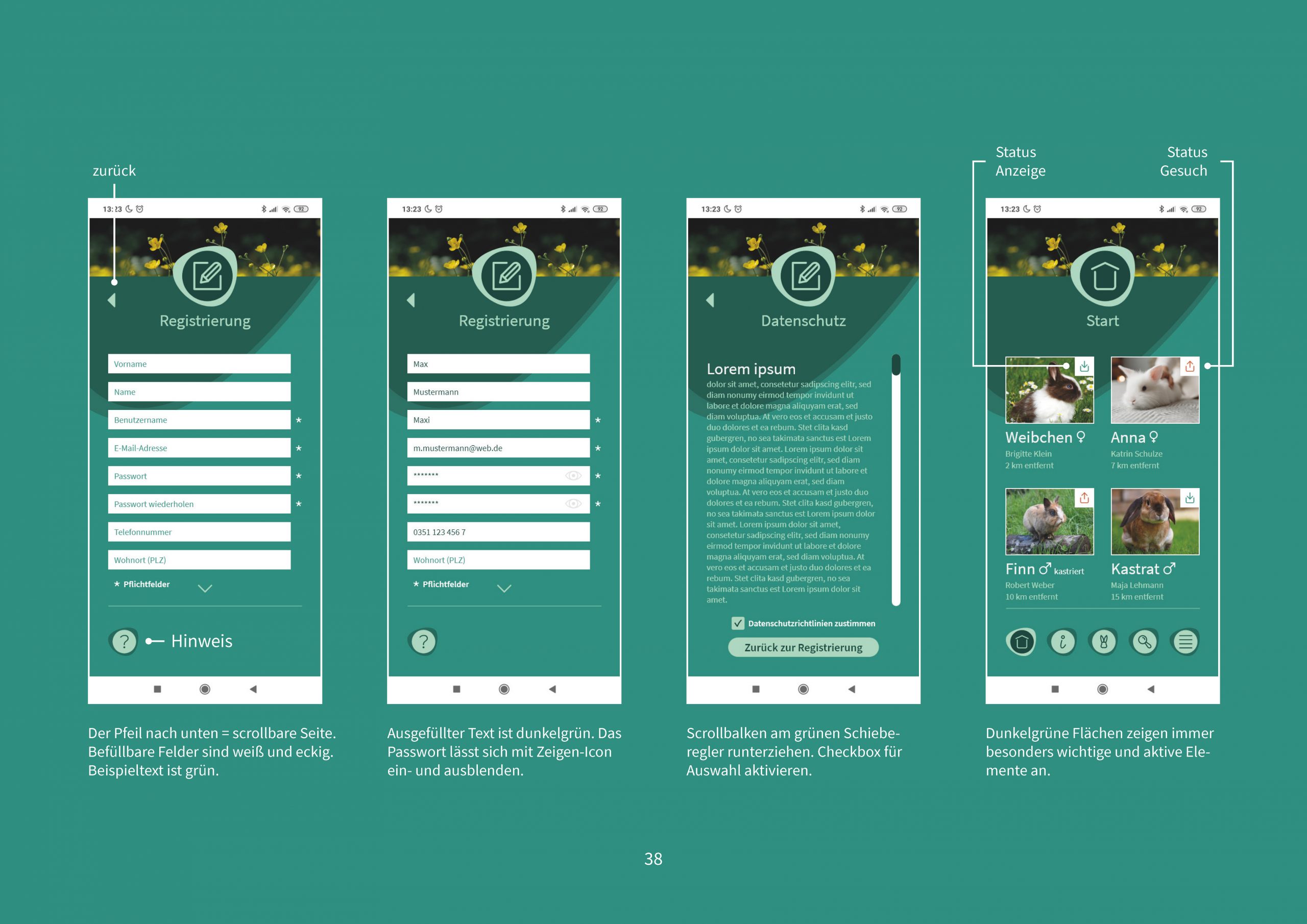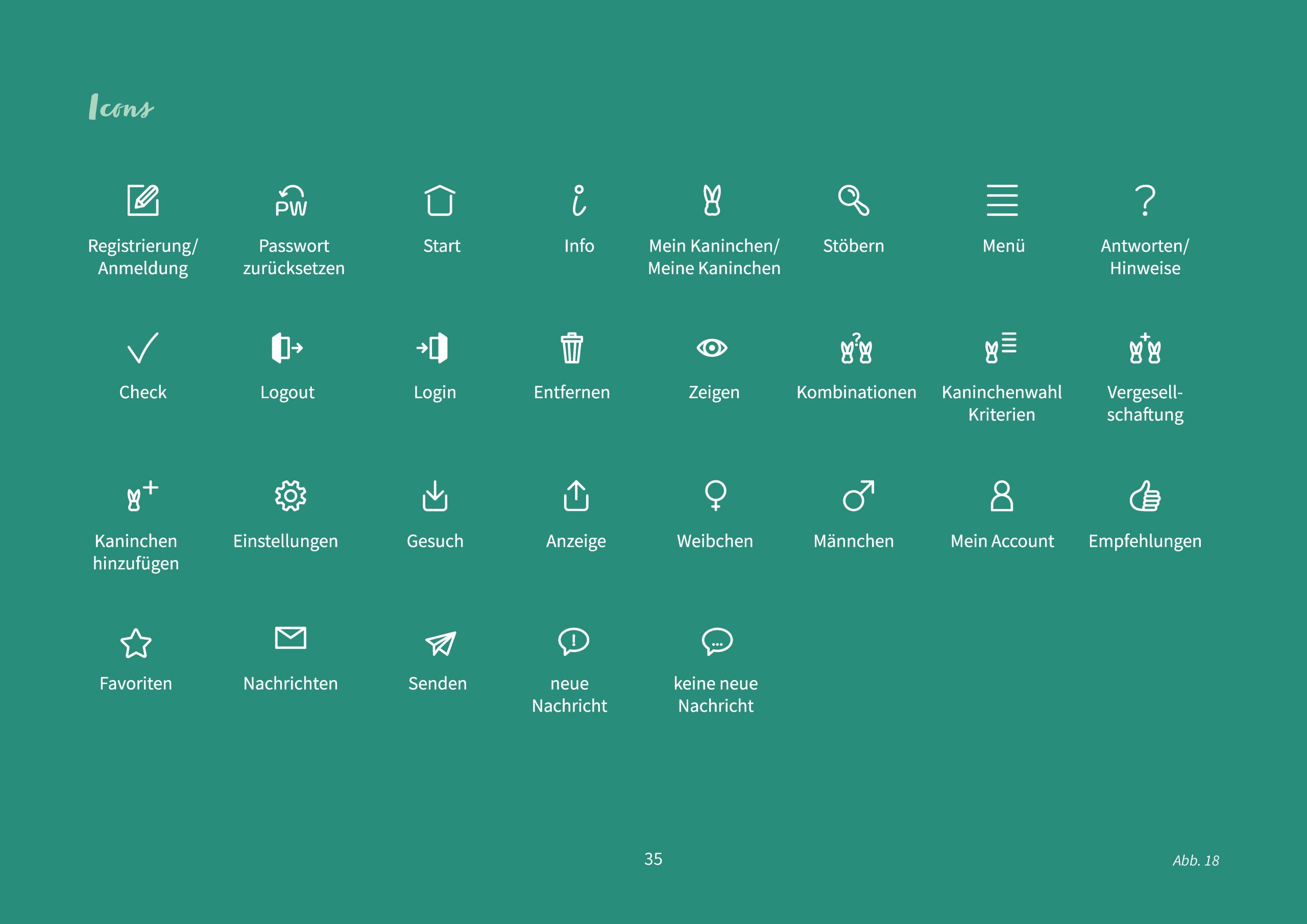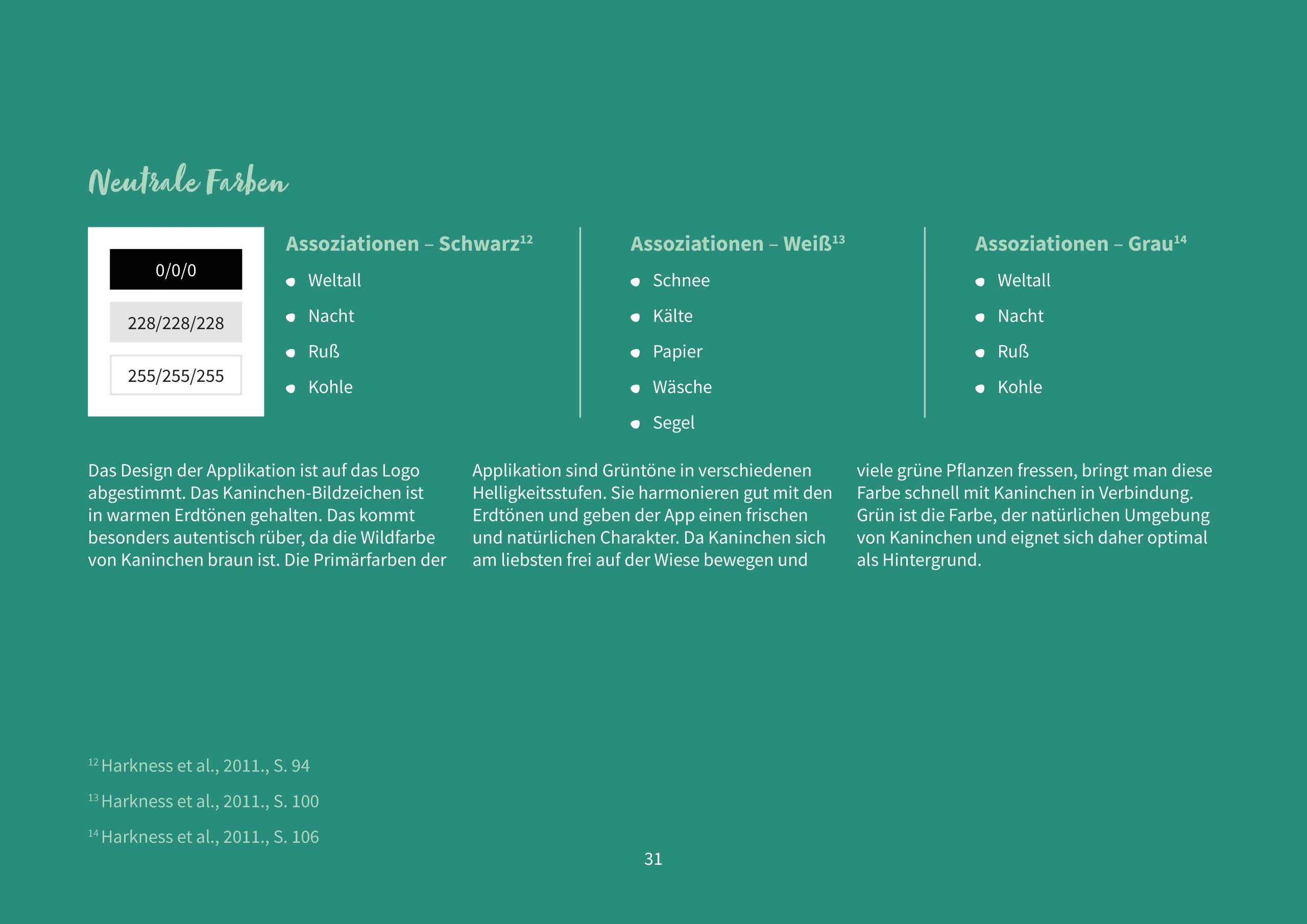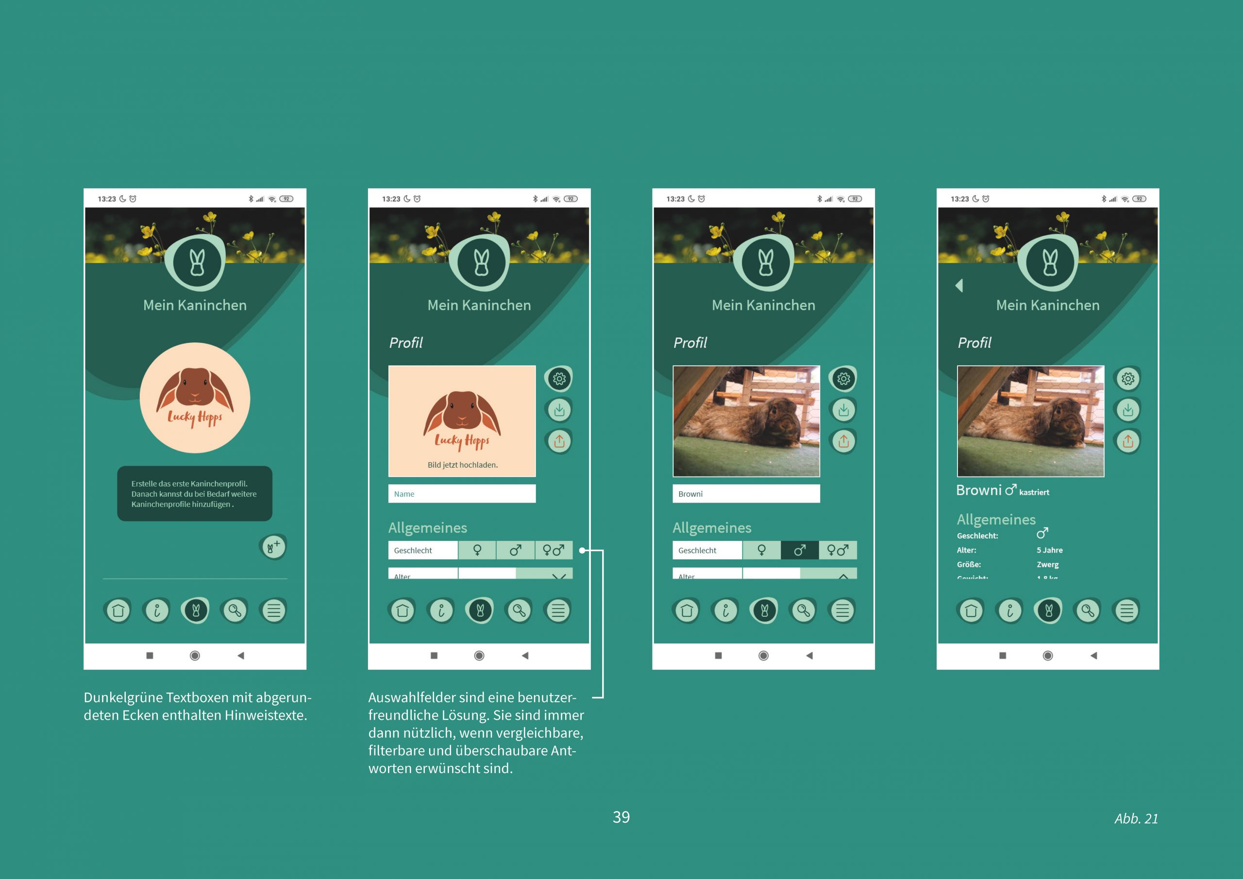 Das Design der Applikation ist auf das Logo abgestimmt. Das Kaninchen-Bildzeichen ist in warmen Erdtönen gehalten. Das kommt besonders authentisch rüber, da die Wildfarbe von Kaninchen braun ist. Die Primärfarben der Applikation sind Grüntöne in verschiedenen Helligkeitsstufen. Sie harmonieren gut mit den Erdtönen und geben der App einen frischen und natürlichen Charakter. Da Kaninchen sich am liebsten frei auf der Wiese bewegen und viele grüne Pflanzen fressen, bringt man diese Farbe schnell mit Kaninchen in Verbindung. Grün ist die Farbe der natürlichen Umgebung von Kaninchen und eignet sich daher optimal als Hintergrund.