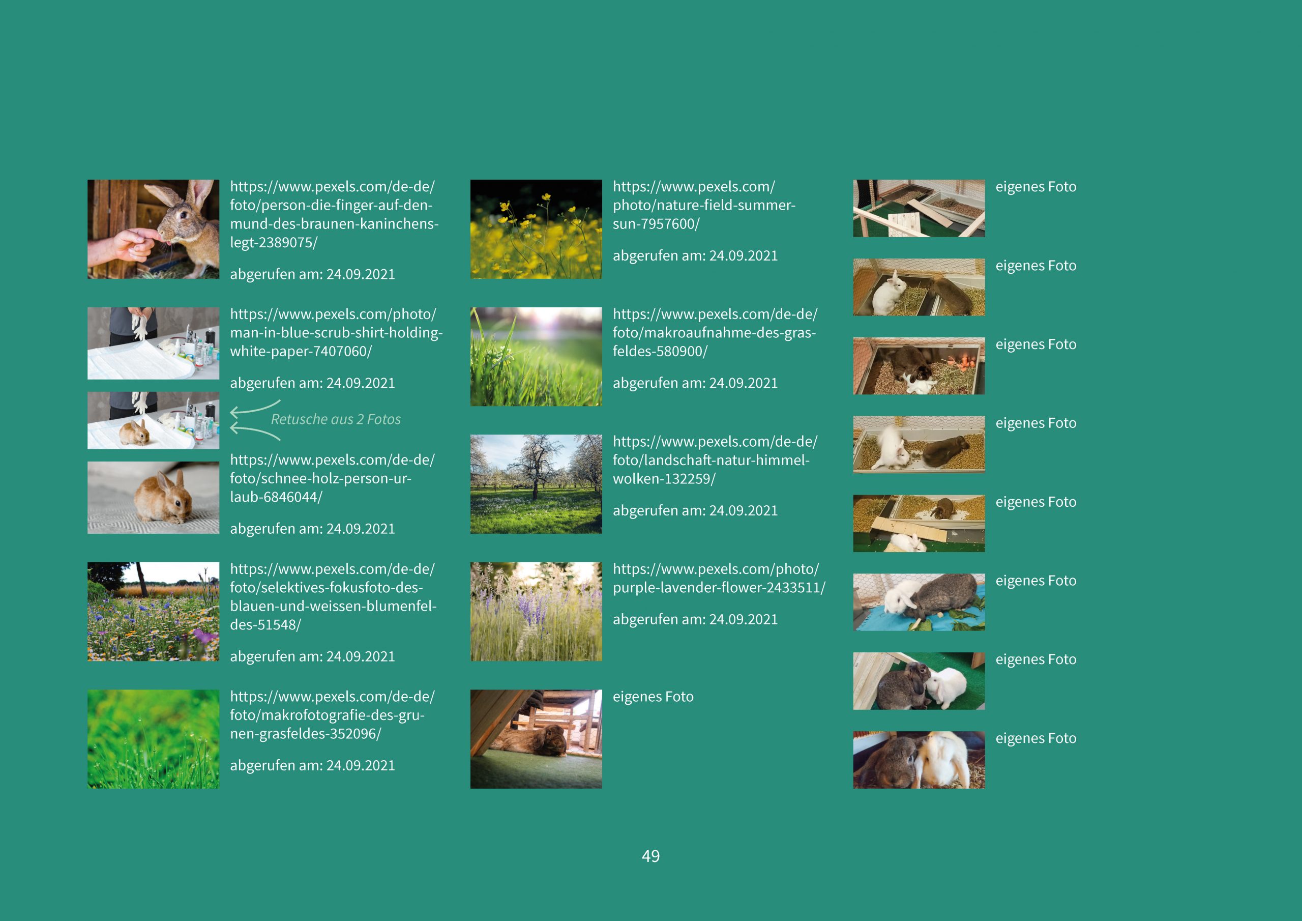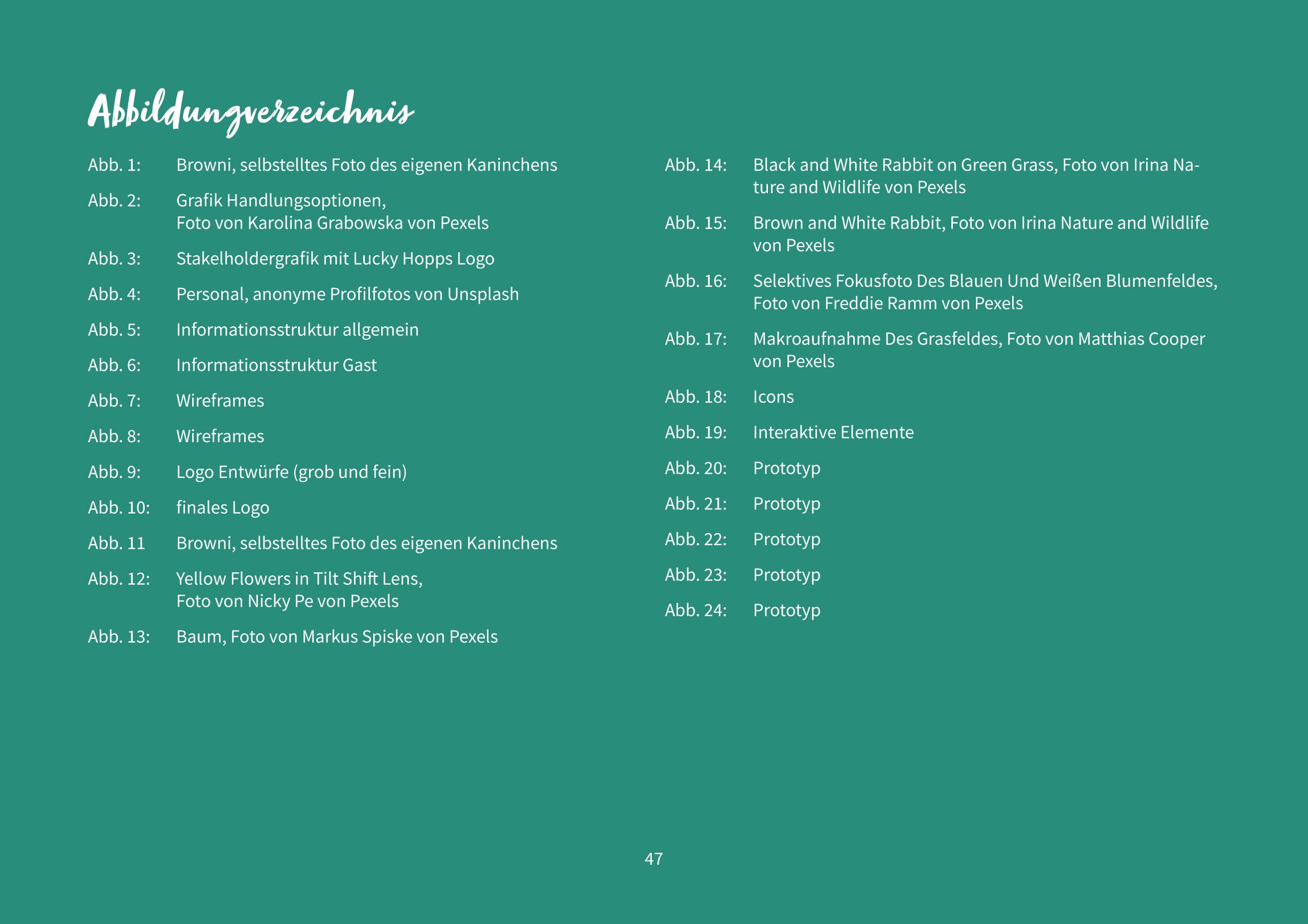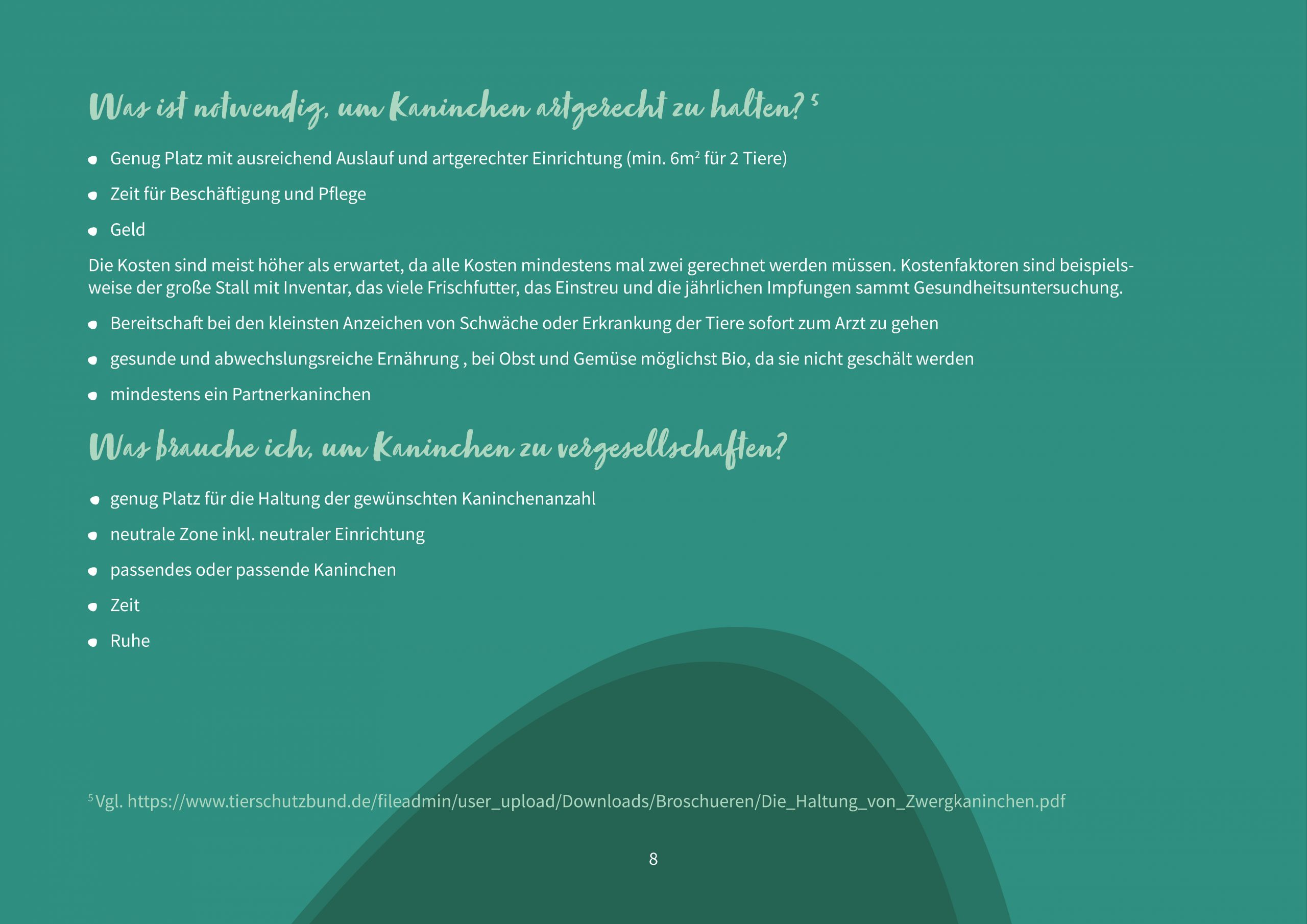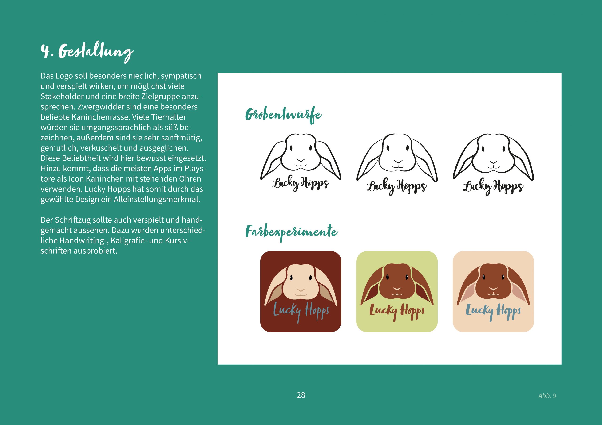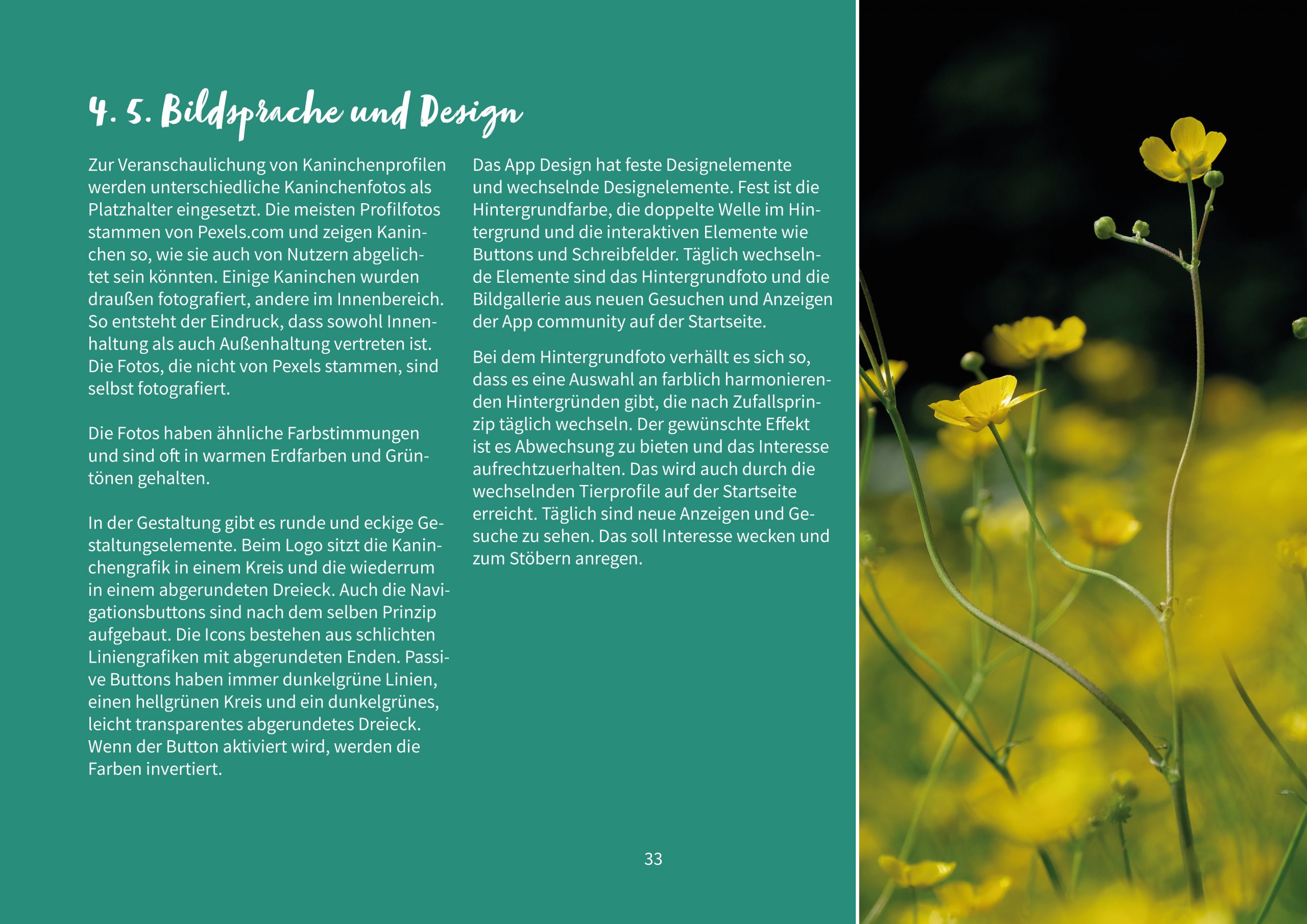 Das Design der Applikation ist auf das Logo abgestimmt. Das Kaninchen-Bildzeichen ist in warmen Erdtönen gehalten. Das kommt besonders authentisch rüber, da die Wildfarbe von Kaninchen braun ist. Die Primärfarben der Applikation sind Grüntöne in verschiedenen Helligkeitsstufen. Sie harmonieren gut mit den Erdtönen und geben der App einen frischen und natürlichen Charakter. Da Kaninchen sich am liebsten frei auf der Wiese bewegen und viele grüne Pflanzen fressen, bringt man diese Farbe schnell mit Kaninchen in Verbindung. Grün ist die Farbe der natürlichen Umgebung von Kaninchen und eignet sich daher optimal als Hintergrund.