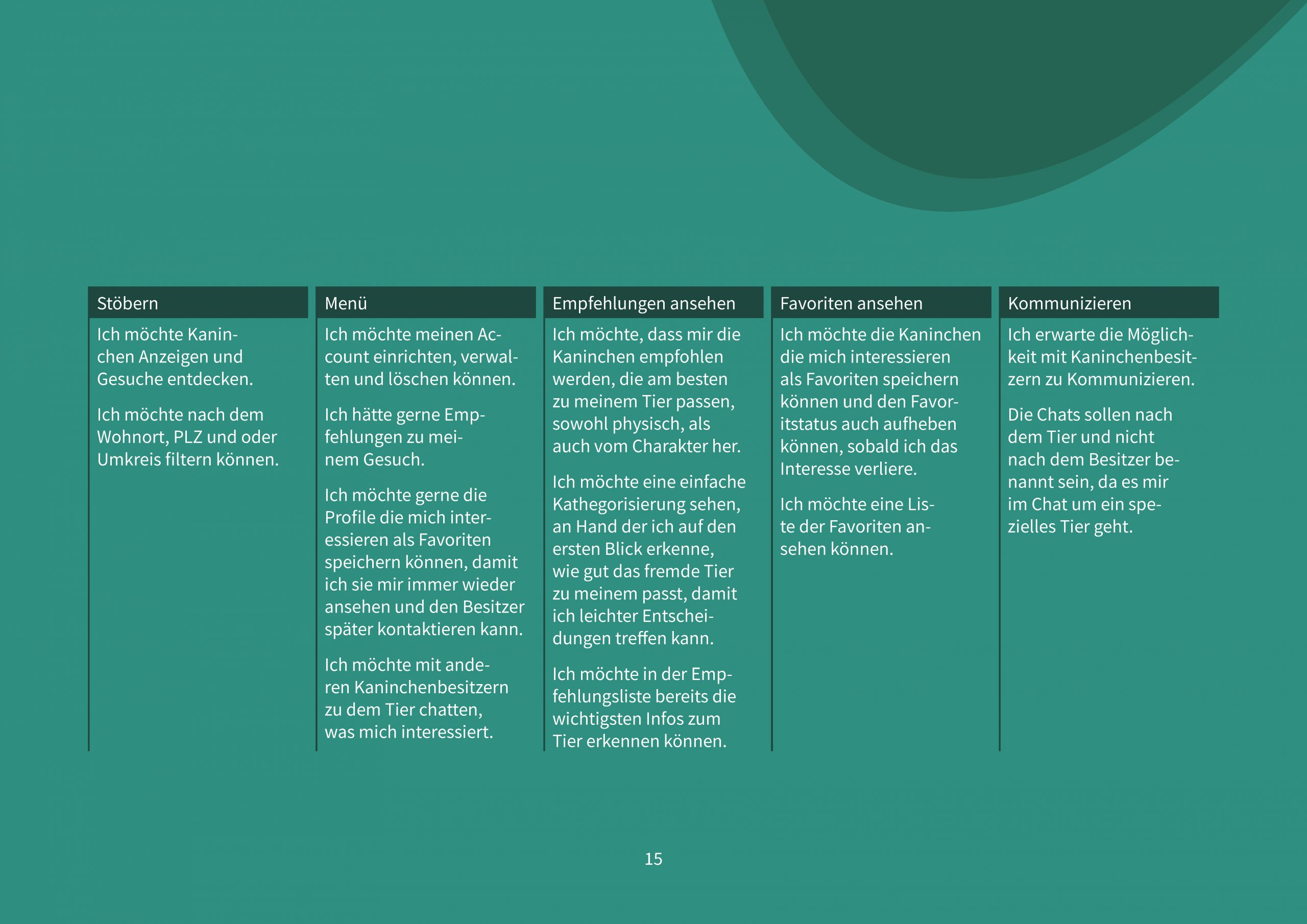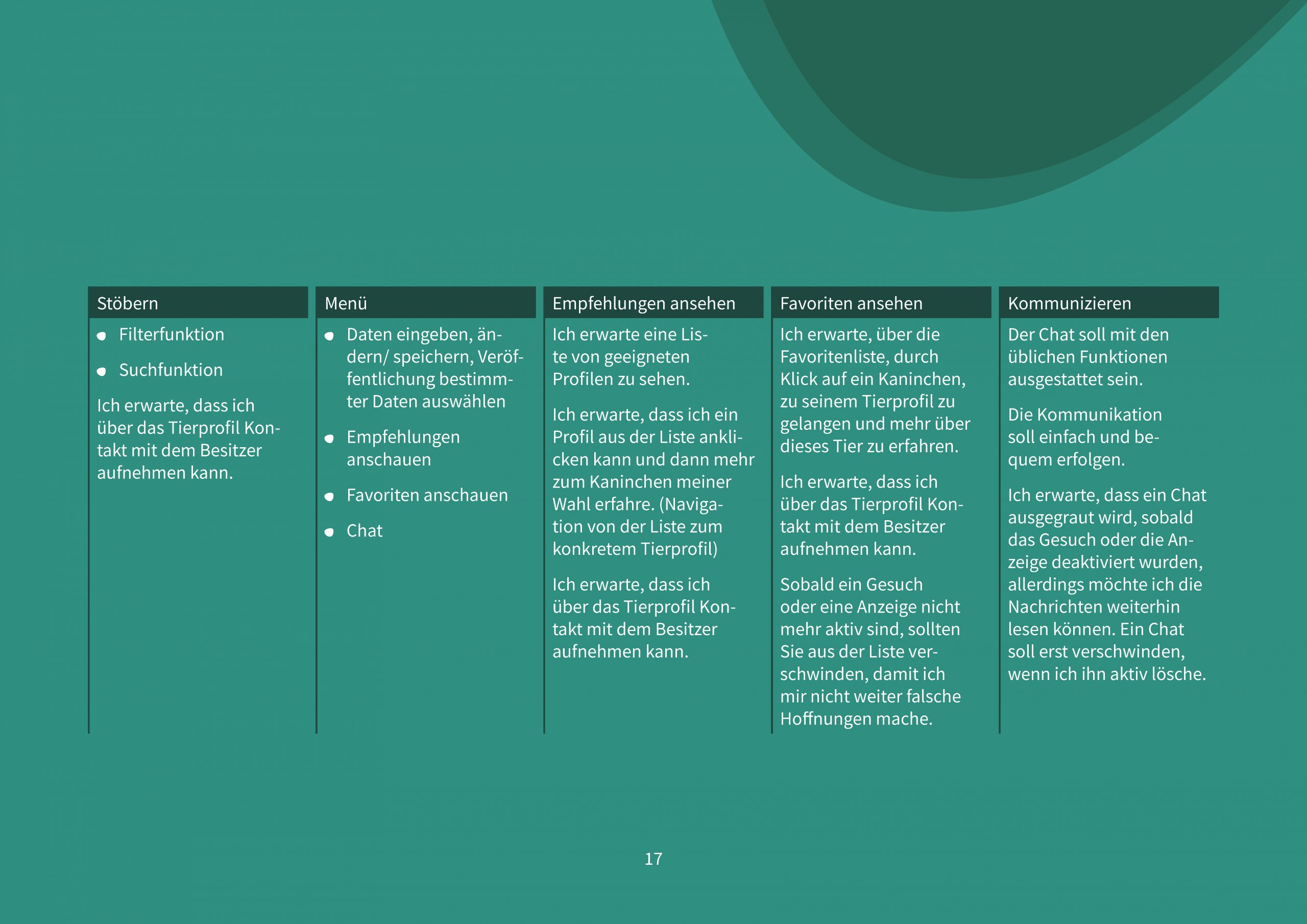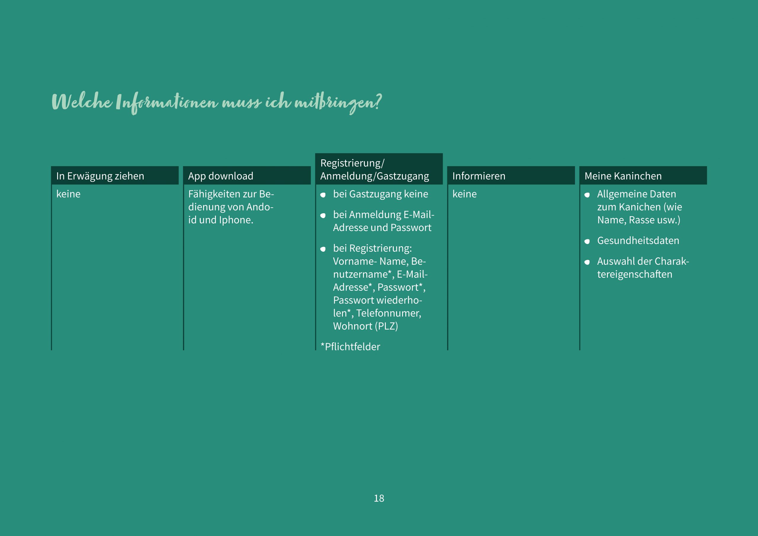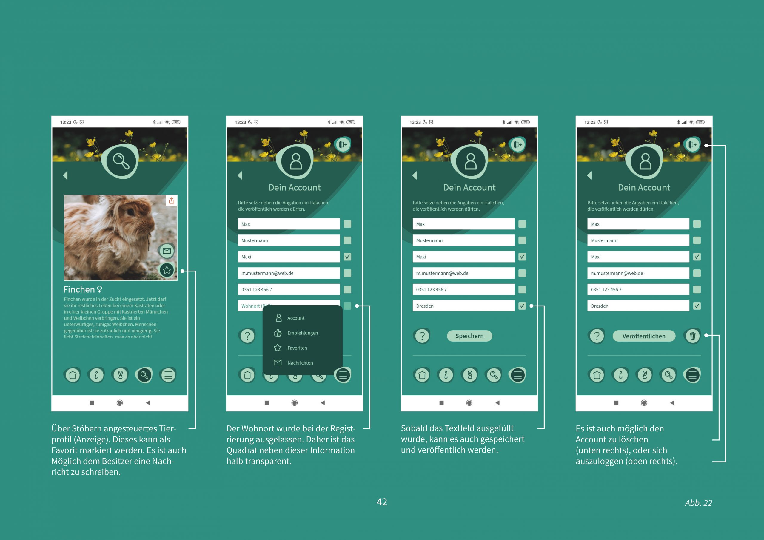 Kaninchenbesitzer können sich jederzeit in der App registrieren. Es können ein oder mehrere Tierprofile angelegt, gespeichert und nachträglich bei Bedarf bearbeitet werden. Bei jedem Tierprofil kann bei Bedarf ein Gesuch oder eine Anzeige aktiviert werden. Dann erscheinen noch einige weitere Felder, die das bisherige Profil um notwendige Informationen ergänzen. Sobald man im Profil auf den Gesuchbutton klickt, erscheint neben den bekannten Daten ein Feld für den Gesuchtitel und den Gesuchtext. Beide Felder sind auszufüllen. Bei den Charaktereigenschaften sind die vorausgewählt, die gut zum bisherigen Tier passen würden. Die bereits vorausgewählten Einstellungen können geändert werden. Bei einer Anzeige ist noch weniger zu tun. Da ist lediglich ein Anzeigetext einzutragen. Wenn die Bearbeitung abgeschlossen ist, kann auf Speichern und auf Veröffentlichen gedrückt werden. Es gibt Info-Overlays zu bestimmten Fakten, die geöffnet und wieder geschlossen werden können. Nach der Veröffentlichung eines Gesuchs bekommt der Suchende sofort passende Profile von verfügbaren Kaninchen angezeigt. Der intelligente Algorithmus analysiert für die Empfehlungsliste die Kaninchendaten aller Anzeigen. Wenn der Besitzer im Account den Wohnort veröffentlicht hat, wird dieser in der Empfehlungsliste berücksichtigt. Das Tier mit der höchsten Übereinstimmung wird zuerst angezeigt. Also der beste Match mit der geringsten Entfernung. Wird der Wohnort nicht angeben, fehlen in der Empfehlungsliste die Entfernungsangaben. Die Matches werden vom Algorithmus automatisch mit Sternen bewertet. Je mehr Übereinstimmung ein Tier mit dem Gesuch hat, desto mehr Sterne bekommt die Empfehlung.