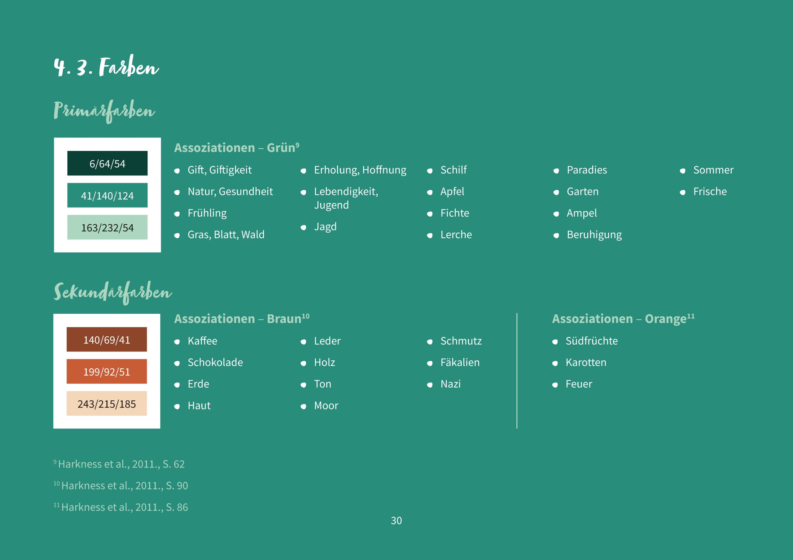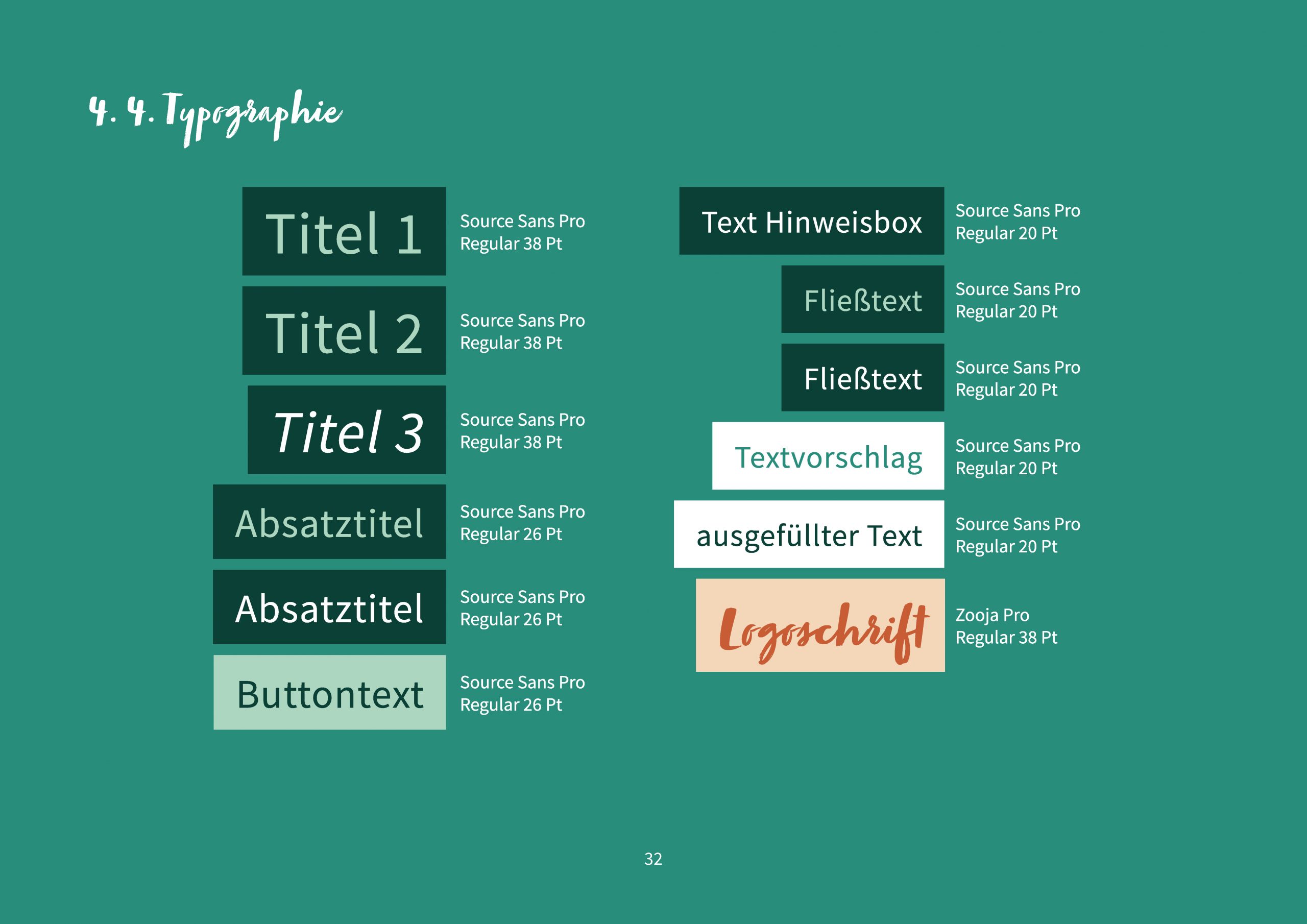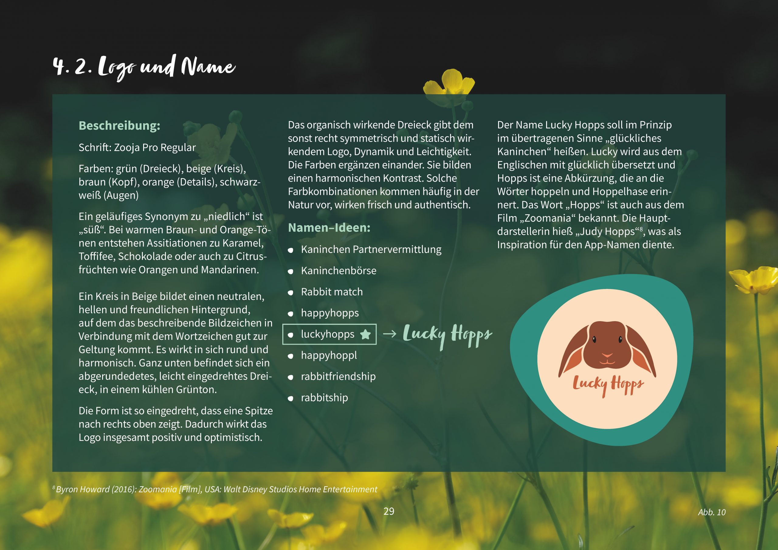 Das Logo soll besonders niedlich, sympathisch und verspielt wirken, um möglichst viele Stakeholder und eine breite Zielgruppe anzusprechen. Der Schriftzug sollte auch verspielt und handgemacht aussehen. Ein geläufiges Synonym zu „niedlich“ ist „süß“. Bei warmen Braun- und Orange-Tönen entstehen Assoziationen zu Karamell, Toffifee, Schokolade oder auch zu Zitrusfrüchten wie Orangen und Mandarinen. Ein Kreis in Beige bildet einen neutralen, hellen und freundlichen Hintergrund, auf dem das beschreibende Bildzeichen in Verbindung mit dem Wortzeichen gut zur Geltung kommt. Es wirkt in sich rund und harmonisch. Ganz unten befindet sich ein abgerundetes, leicht eingedrehtes Dreieck in einem kühlen Grünton. Die Form ist so eingedreht, dass eine Spitze nach rechts oben zeigt. Dadurch wirkt das Logo insgesamt positiv und optimistisch. Das organisch wirkende Dreieck gibt dem sonst recht symmetrisch und statisch wirkendem Logo Dynamik und Leichtigkeit. Die Farben ergänzen einander. Sie bilden einen harmonischen Kontrast. Solche Farbkombinationen kommen häufig in der Natur vor, wirken frisch und authentisch. Die Logo-Schrift ist Zooja Pro Regular. Das ist eine lockere Pinselschrift, die gut lesbar ist und den gewünschten Handmade Charakter aufweist.
