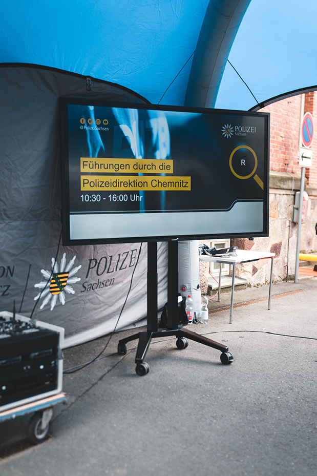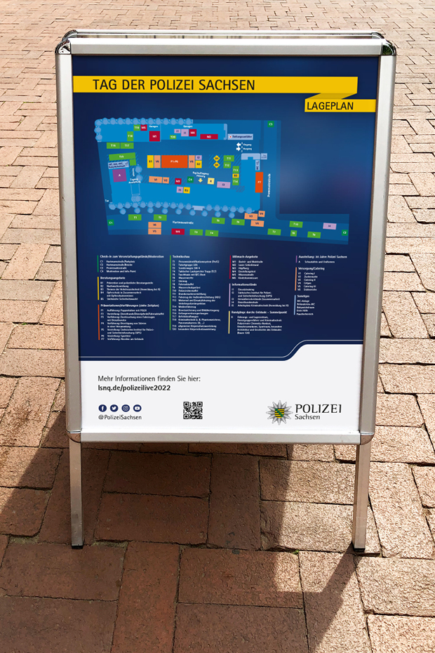Der Tag der Polizei Sachsen wurde von der Polizeidirektion Chemnitz geplant, organisiert und am 11. Juni 2022 ausgerichtet. Mich bat man darum, bei der Medienproduktion zu unterstützen. Das heißt, ich erstellte für diese Veranstaltung sowohl alle Drucksachen, als auch alle Bilder und Grafiken für die Onlinekommunikation. Meine Aufgabengebiete reichten vom Projektmanagement, über die Erstellung der Entwürfe und Reinzeichnungen, bis hin zur Veranlassung der Druckaufträge und Lieferung der angefragten Medienprodukte für die Onlinekommunikation. Am 11. Juni 2022 habe ich die Veranstaltung außerdem fotografisch begleitet.